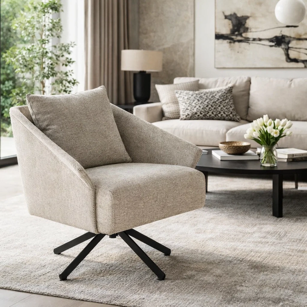 Фотелјата FERGUS е стилски и практичен избор за секој модерен дом или софистициран канцелариски ентериер. Седиштето и потпирачот за грб се изработени од висококвалитетна ткаенина, а ногарките се изработени од метал со прашкасто обложување. За поголема удобност, моделот има функција за вртење од 360°.